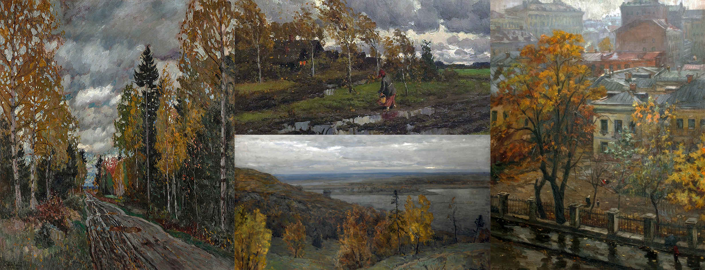 Представлены полотна следующих живописцев: по краям Станислава Жуковского, Анастасии Соколовой-Скаля; по середине Александра Маковского, Витольда Бялыницкого-Бируля.