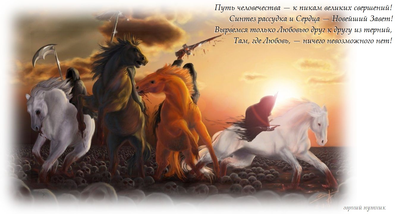 Большинство эзотерических учений упоминают об этом времени. Такое на земле уже случалось, и не однажды. Глобальное очищение планеты от чумы невежества - неизбежная профилактика на смене эпох. Уходящая эпоха Кали Юги, называемая также эпохой тьмы, уступает место эпохе Света, Сатьи Юге и её первому наместнику - Аквариусу (Водолею). Достойные жить в новой эпохе, возводящие ковчеги своих сознаний, своей нравственности, своего Духа, будут спасены. Остальные... (развожу руками). Глобальный катаклизм уже бушует. Невежество уже стирается с лица земли. Четвёртый всадник просто поставит точку (и выжившие позавидуют мёртвым). Думаю, последними невеждами, которые позавидуют мёртвым, будут самые отъявленные и самые гнилые отщепенцы и подонки, "благодаря" которым раса людей опустилась до двуногих животных.