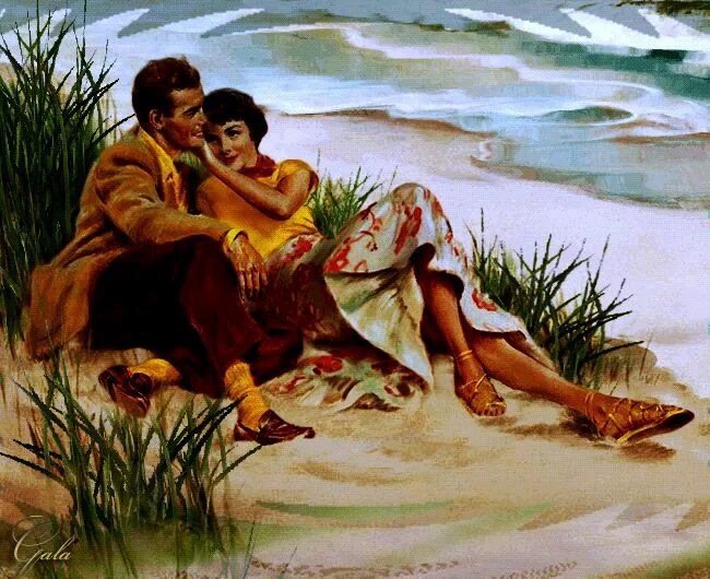 На берегу сидели прижав щеку к щеке,
