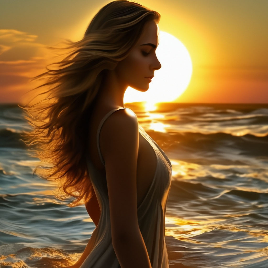 Лучи заката мягким светом освещают, богини стан и глаз бездонные моря…