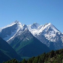 Небо ясное. Снежные горные шапки.