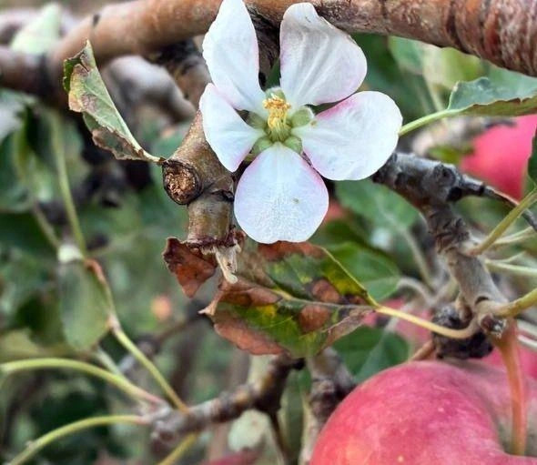 на яблонях плоды соседствуют с цветами.