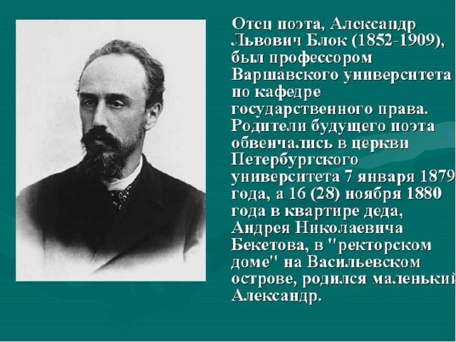 Отец Александра Блока, обладавший незаурядным умом, имел очень странный характер. Он умело играл на рояле, любил Шумана, Шуберта и Шопена. Музыка была для него не просто техникою, а живым, мистическим общением с космосом.