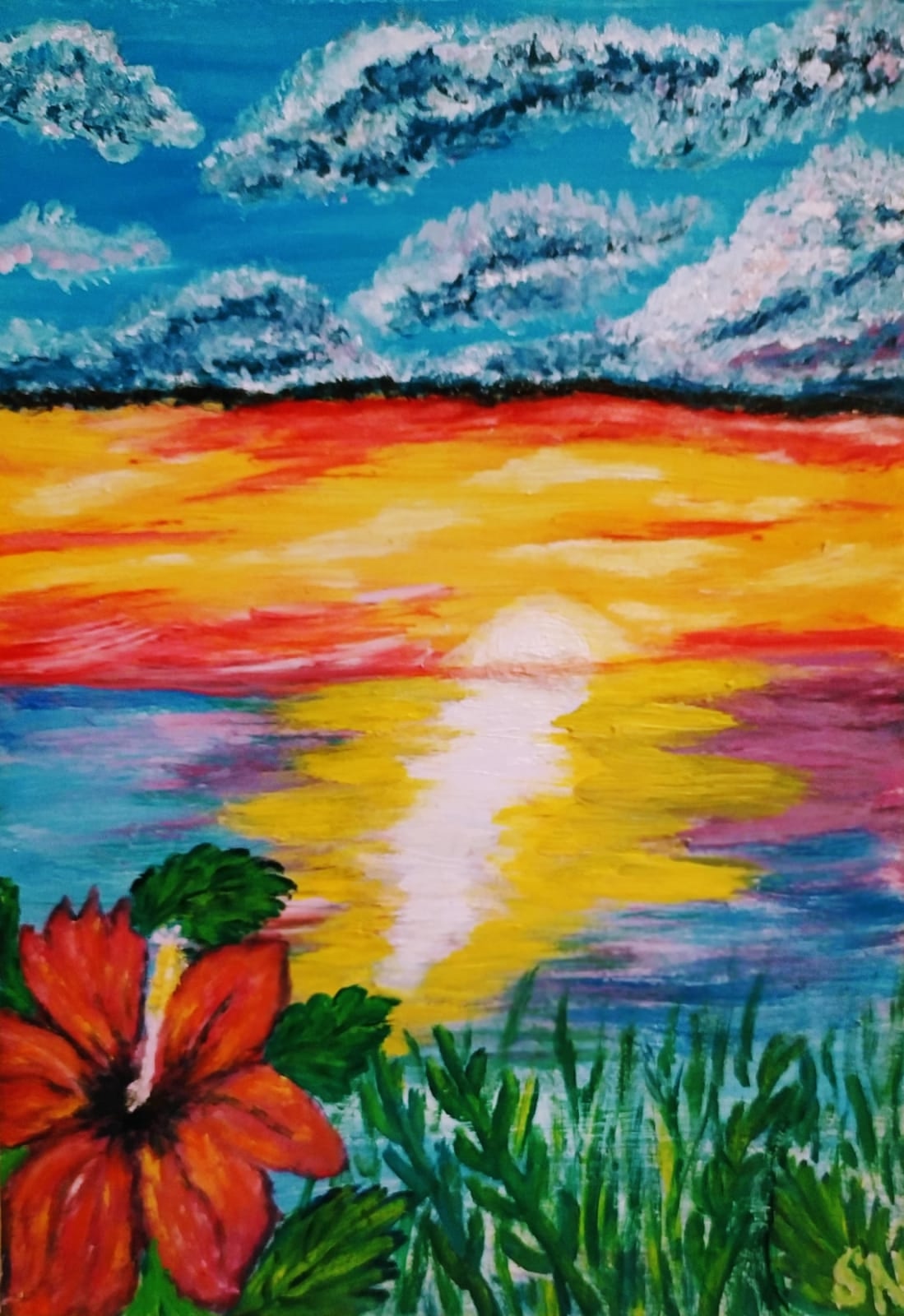 Удивительной красоты закат нарисовала СВЕТЛАНА НИГМАТЗЯНОВА, художник из г. Ангарск Иркутской области. Он подобен такому же красивому алому цветку, а вместе они составляют единое целое, возвращающее к жизни всё померкшее, не дают угаснуть её самым красивым проявлениям и у нас появляется возможность насладиться этими волшебными красками.