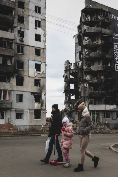 Фото: 5 марта 2023 года. Украинская семья прогуливается по центру Бородянки мимо жилого дома, который годом ранее подвергся бомбардировке в первые дни войны.