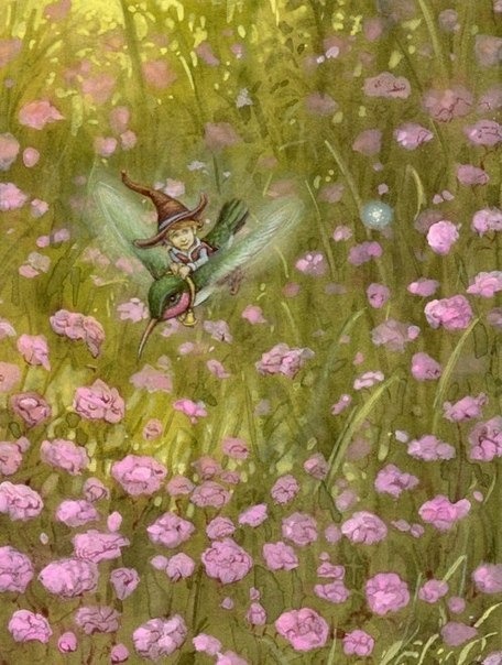 Гном на птичке над лугом./