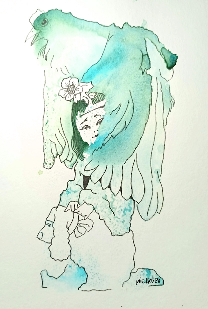 В бирюзовом кимоно.