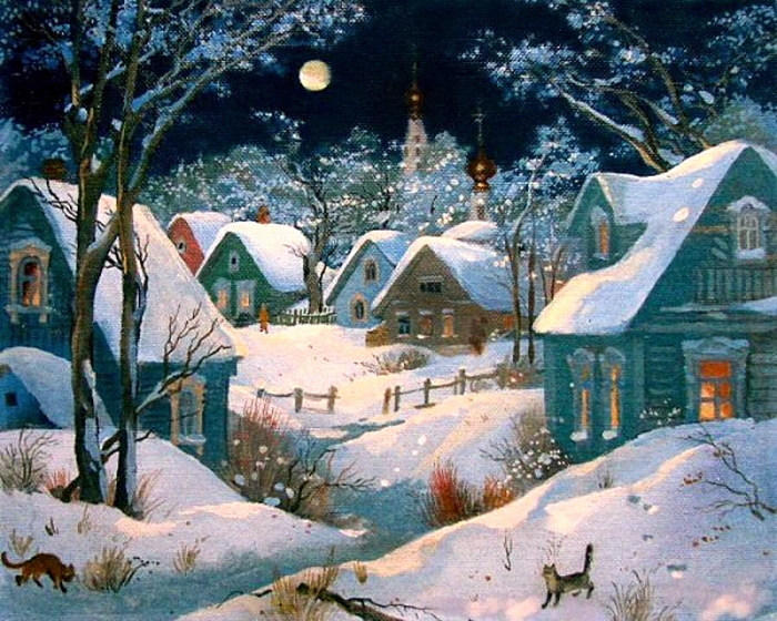 Олег позвонил, долго убалтывал, прислал шёлковую невероятных цветов пижаму, заказал автомобиль. И я сдалась. Но в душе не могла принять этот бред. Пока ждала машину, смотрела в окно. Лубочная картинка! Аккуратные домики, укутанные снегом, тёплый свет из окон, Луна круглощёкая и... встреча кошек. Вернее, кота и кошки. Тоже свидание? Вечеринка? Гм... А ведь у них там интереснее!