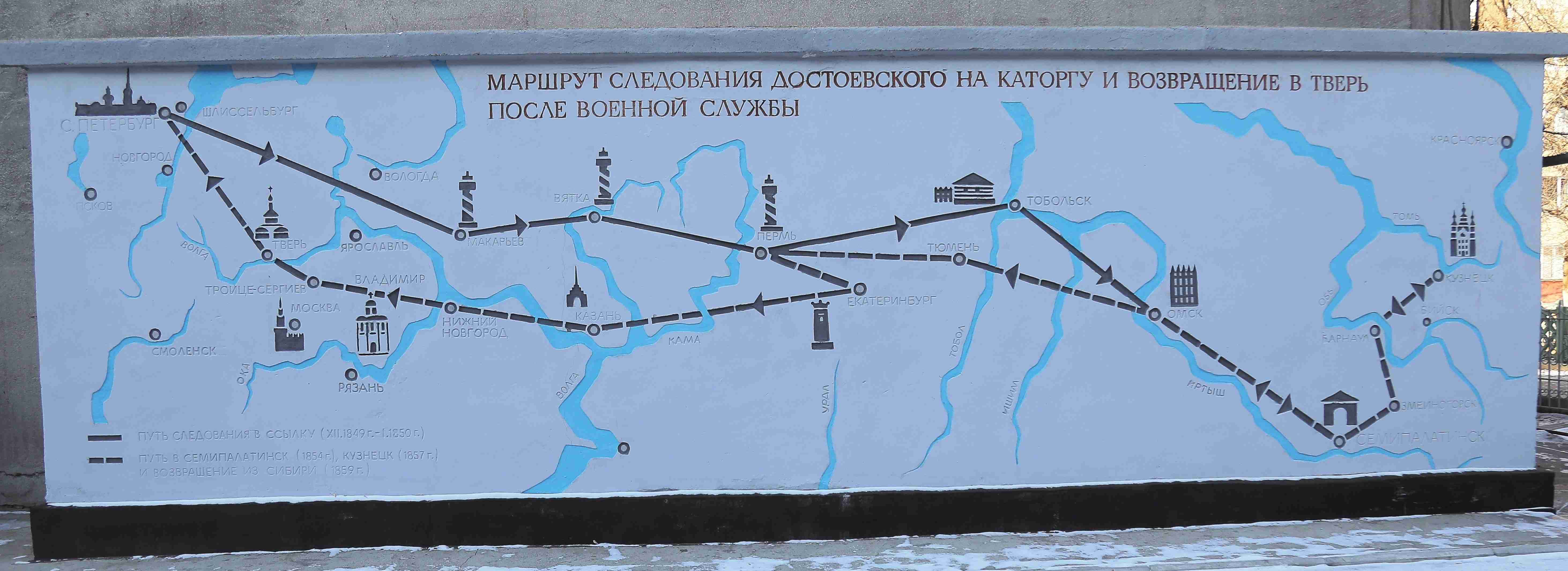 На фото: карта - маршрут следования Достоевского на каторгу и возвращение в Тверь после военной службы. Литературно-мемориальный музей Ф. М. Достоевского, г. Семей Республика Казахстан.
